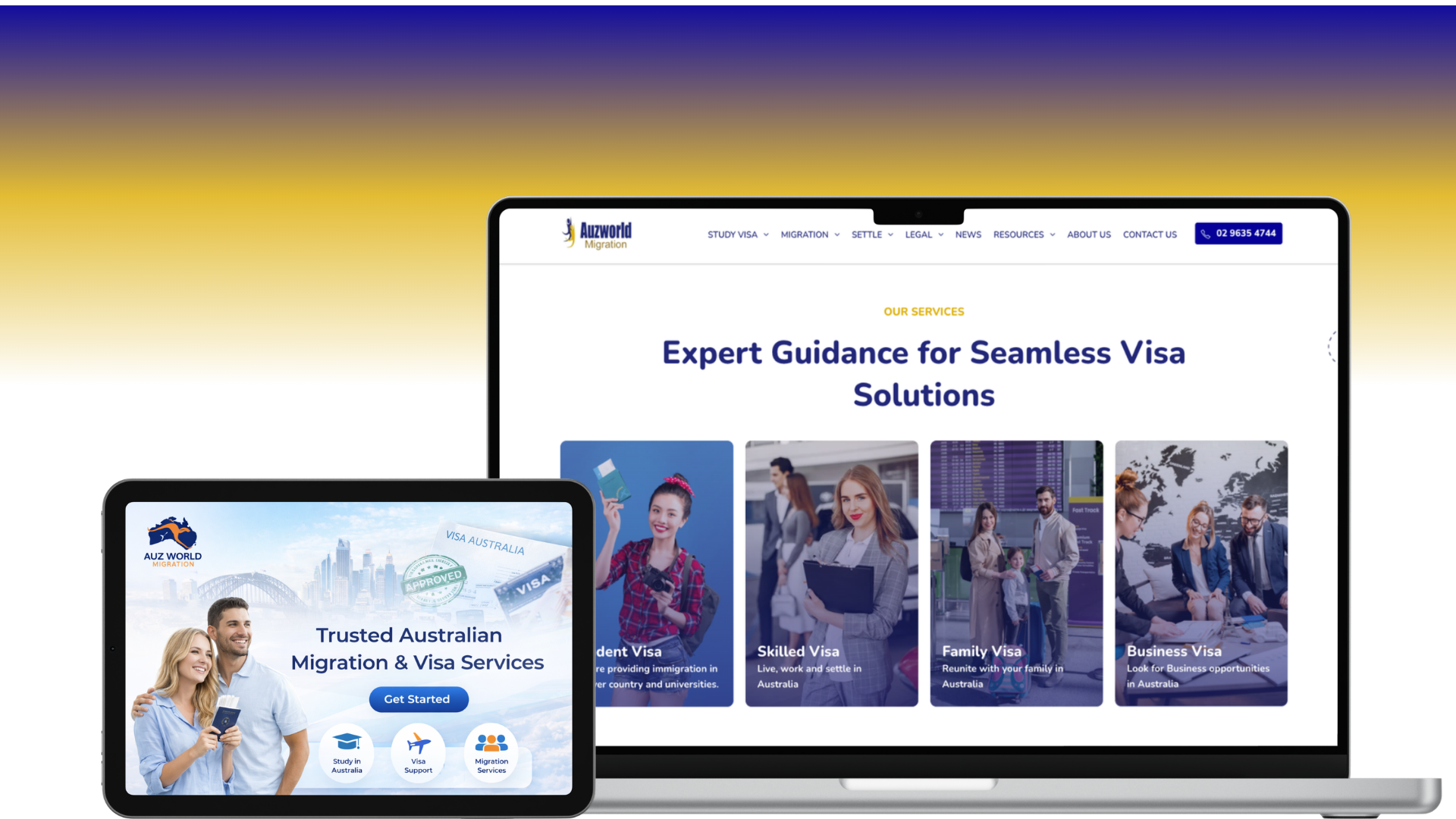 Auzworld Migration provides "Expert Guidance for Seamless Visa Solutions," helping individuals live, work, and settle in Australia. We developed a trust-focused portal that manages the complexity of Australian migration, providing a clear pathway for students, families, and business professionals looking for a new start.